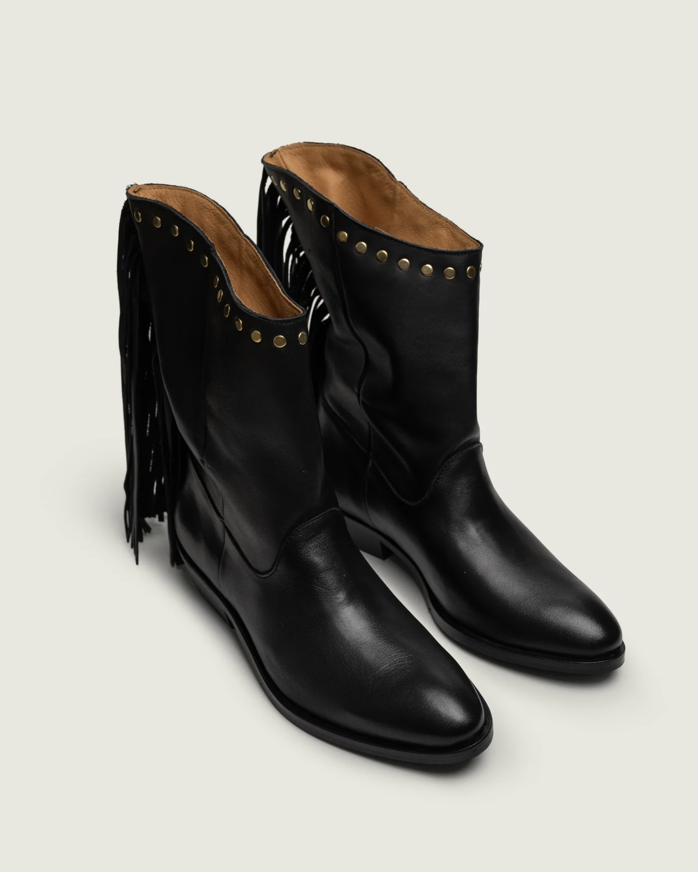 Handcrafted from supple, grain-finished black leather, these boots embody quiet strength and effortless sophistication. The fluid fringe drapes elegantly along the side, adding movement and character with every step, while antique brass studs trace the curved top line, a nod to classic cowboy craftsmanship. With their refined silhouette, low stacked heel, and smooth inner lining, they strike the perfect balance between rugged independence and polished style. Whether paired with denim or a flowing skirt, these boots carry the spirit of adventure, grounded in luxury, designed to roam.