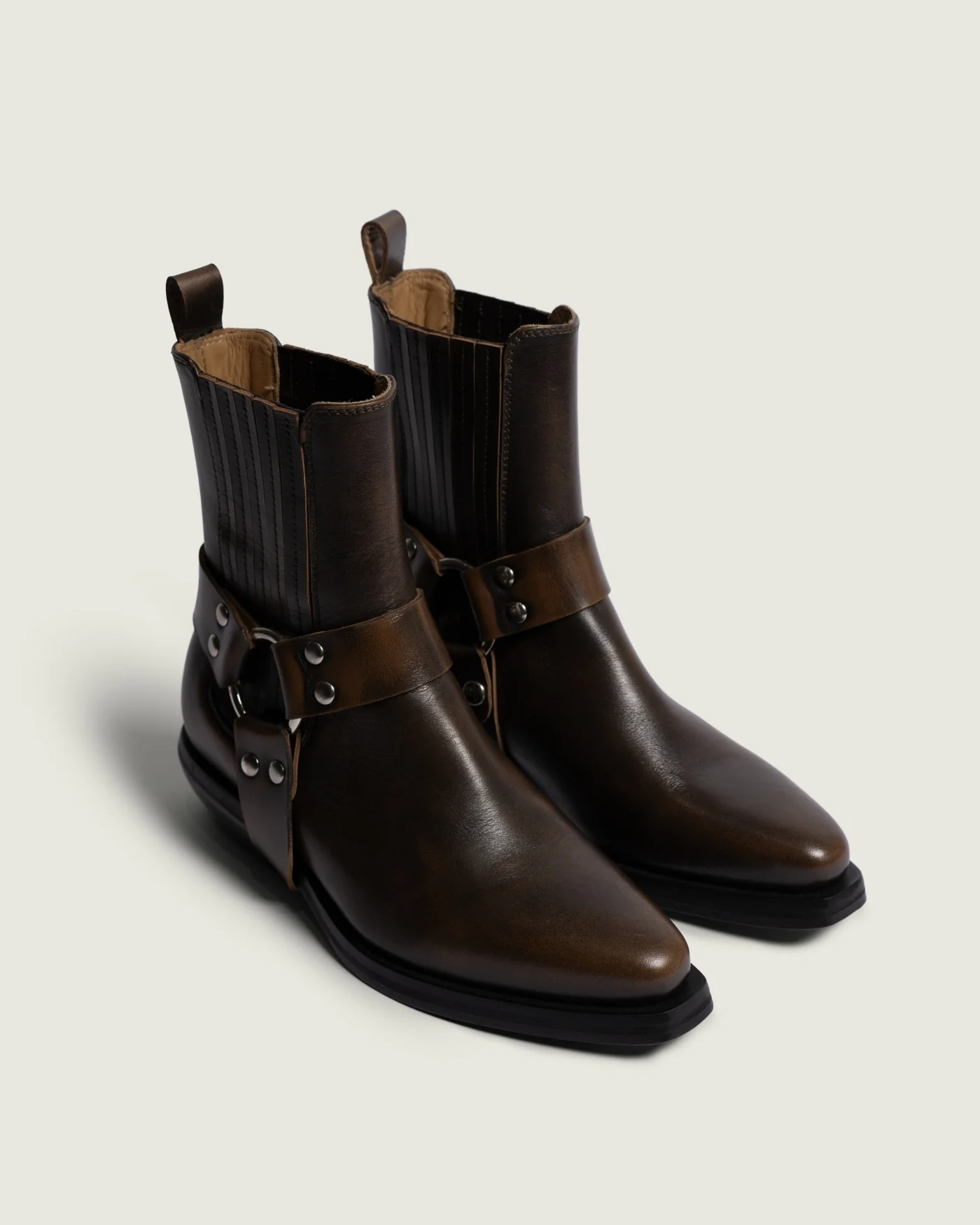 Where the bold spirit of the American West meets the artistry of Italian design. These harness boots are handcrafted from rich, vintage-finished leather that ages beautifully over time. The iconic Western silhouette, complete with a stacked Cuban heel and metal-ring harness, offers unmistakable attitude, while the European-inspired construction ensures a flawless, comfortable fit. Whether you're roaming wide open roads or city streets, these boots bring together raw edge and refined elegance in every step.